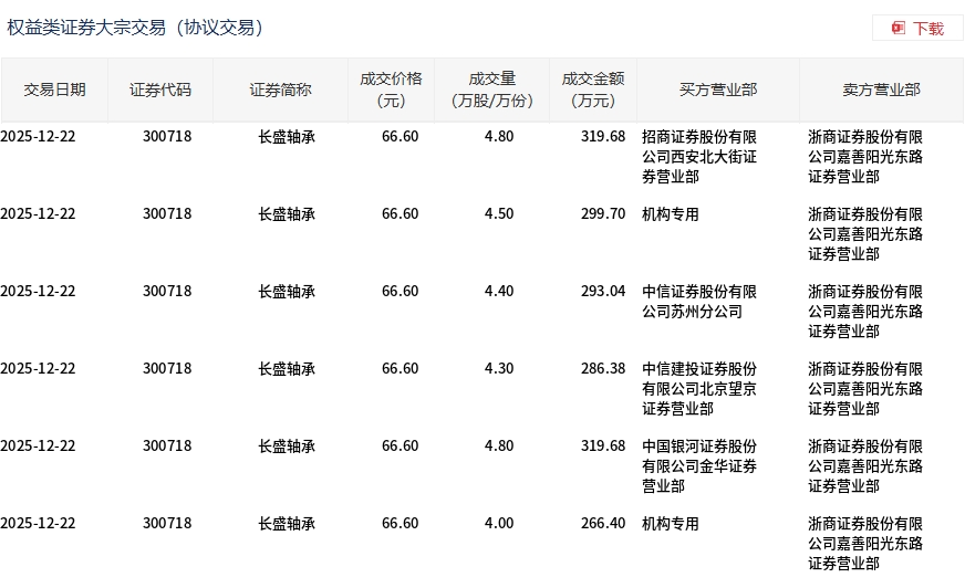 12月22日,长盛轴承大宗交易成交26.8万股,成交额1784.88万元,占当日总成交额的1.33%,成交价66.6元,较市场收盘价83.24元折价19.99%。
